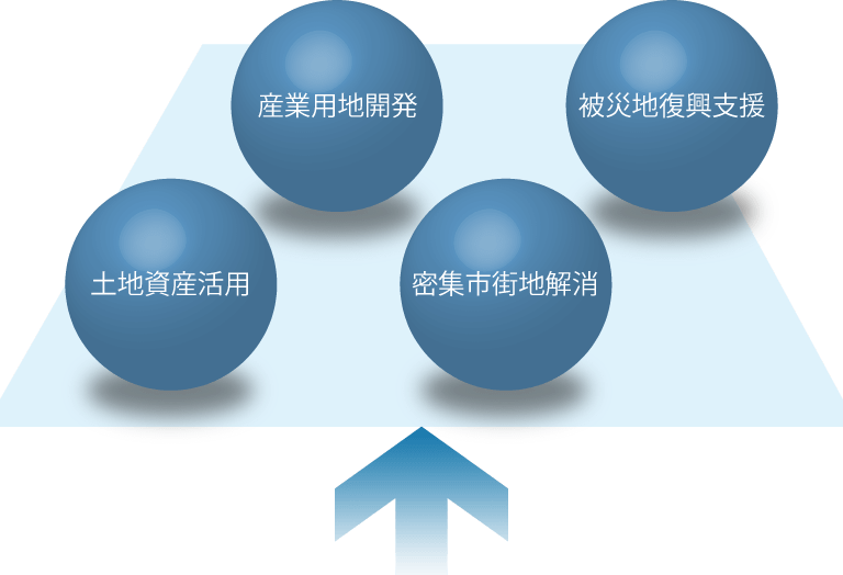 区画整理事業立ち上げなどの促進支援/調査・計画から換地、事業完了までの各業務/組合の運営管理・事業健全化の検討/土地活用サポート/プロジェクトマネジメント支援